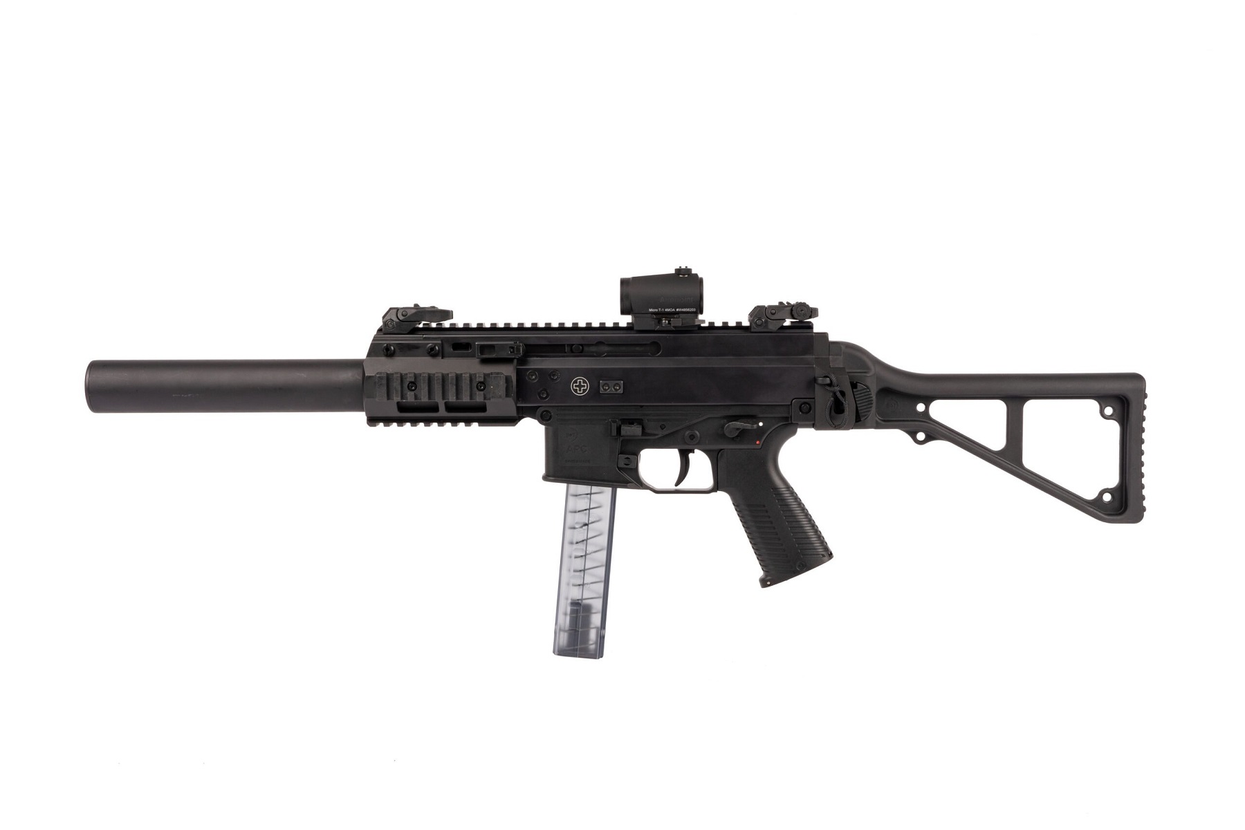 Das APC9 SD PRO ist die nächste Evolutionstufe der bewährten APC Familie. Mit den nicht mitlaufenden beidseitigen Spanngriffen, sowie seinen diversen anderen Eigenschaften, erfüllt das APC SD PRO die heutigen Anforderungen der Polizei und ist somit auch für Sportschützen eine attraktive Waffe.Dank des integrierten Schalldämpfers ist die Waffe sehr leise. Aufgrund spezieller Bohrungen direkt vor dem Patronenlager kann auch Überschallmunition verwendet werden, da diese durch die Bohrungen auf Unterschallgeschwindigkeit reduziert wird.