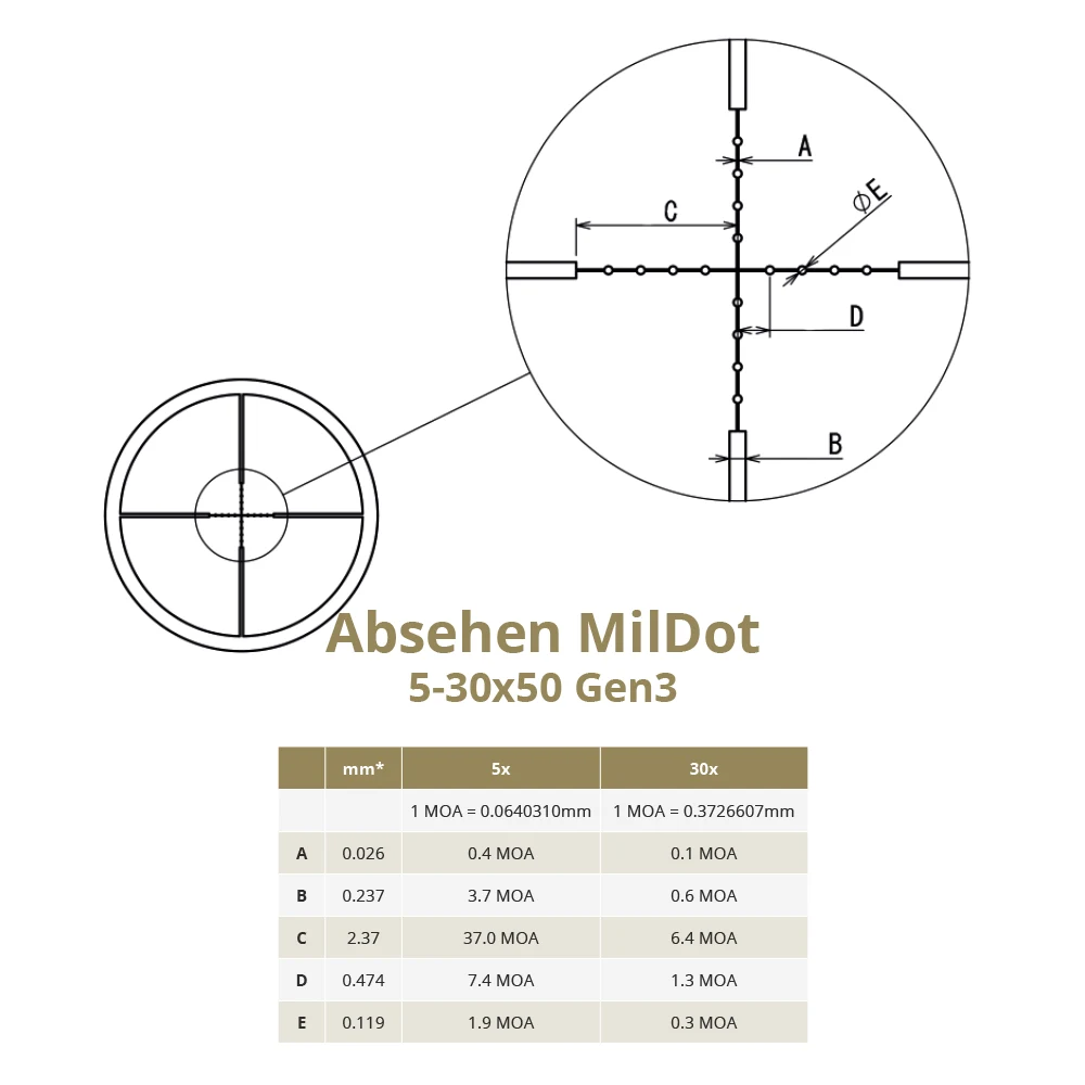 Das Zielfernrohr Nighteagle V6 5-30x50 NFX verfügt über ein taktisches Mildot Leuchtabsehen auf der 2. Bildebene. Dieses Mildotabsehen ist auf eine 10-fache Vergrösserung genormt, wodurch es beim Vergrösserungswechsel immer gleich gross bleibt. Selbst bei einer 30-fachen Vergrösserung verdeckt das Fadenkreuz das Ziel lediglich um 1,8 mm bei einer Schussdistanz von 100 m, und das Sehfeld beträgt bei dieser Maximalvergrösserung immer noch 1,3 m auf 100 m. Dank dieser Eigenschaften ermöglicht die Zieloptik ein blitzschnelles Anvisieren. Das Absehen lässt sich pro Klick um 0,1 MRAD verstellen, also um 1 cm auf 100 m. Auf 300 m entspricht dies einer Treffpunktlageveränderung von rund 3 cm pro Klick.