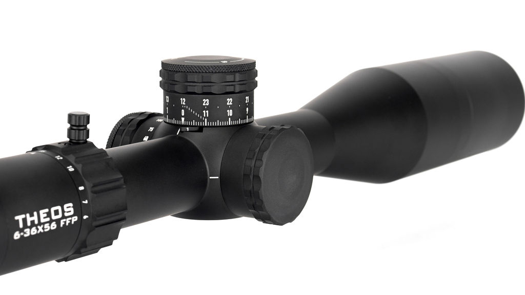 Das Theos 6-36×56 FFP ist das Flaggschiff des Herstellers und das Ergebnis von drei Jahren rigoroser Entwicklung und Tests. Das Theos ist komplett in MRAD ausgeführt und kann sich in seiner Rolle als Zielfernrohr für verschiedene Long-Range Disziplinen mit etablierten, und teureren, Namen der Branche messen. Es hat komplett überarbeitete Verstelltürme und digitale Beleuchtungssteuerung. Zu den Merkmalen dieses Modells gehören eine Umdrehungsmarkierung, die eine visuelle Anzeige bietet, wenn Sie eine volle Umdrehung passieren, ein neuer Nullstoppmechanismus, der kein Werkzeug erfordert, eine digitale Beleuchtung, die den Raum um den Parallaxenknopf frei macht, und ein Blendenring, der die Schärfentiefe bei Bedarf anpasst.