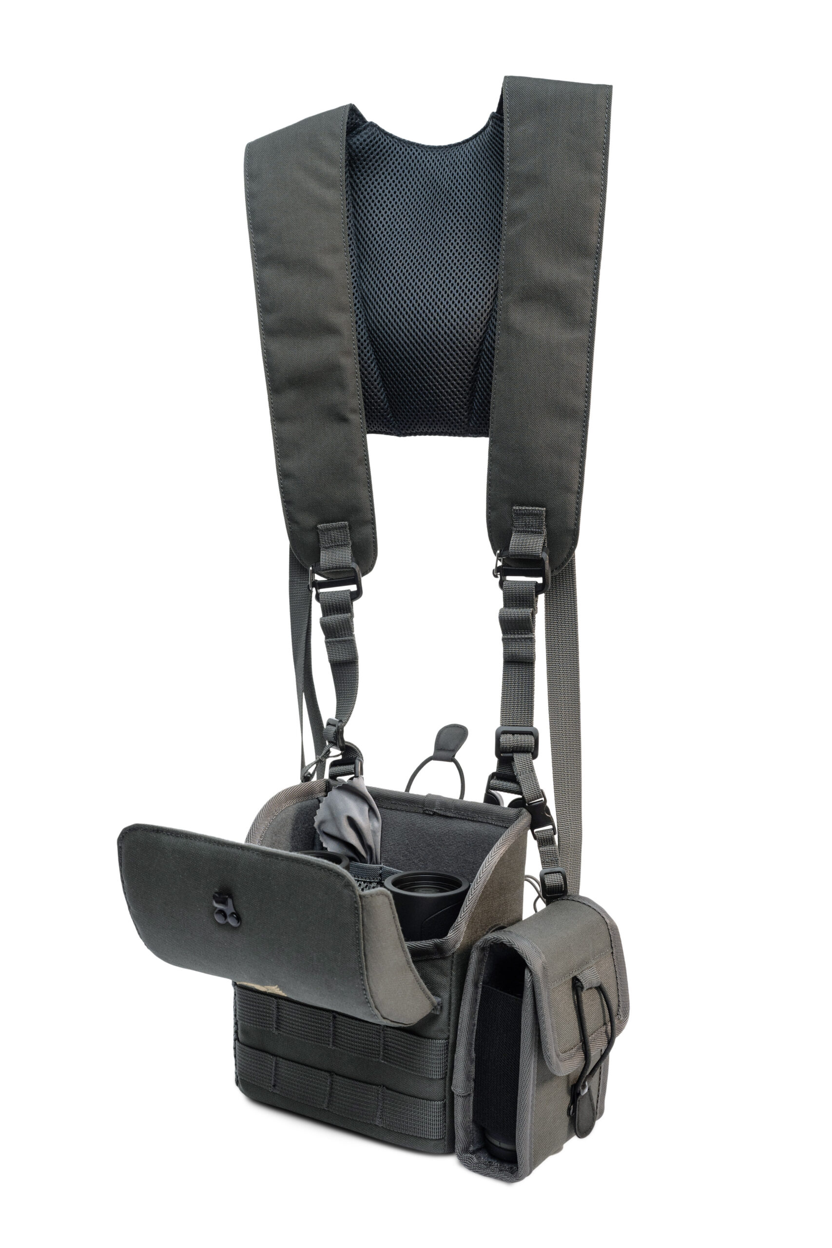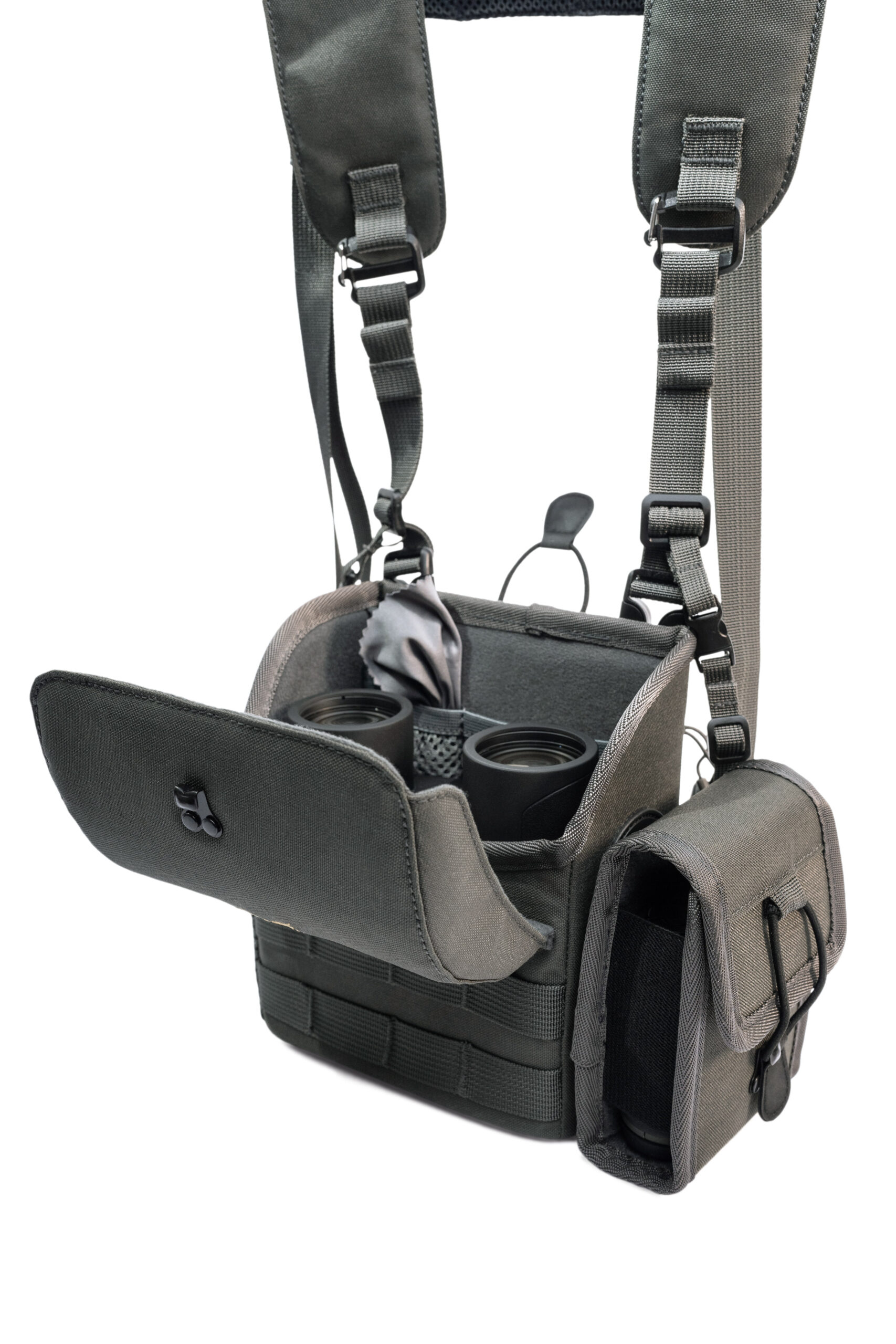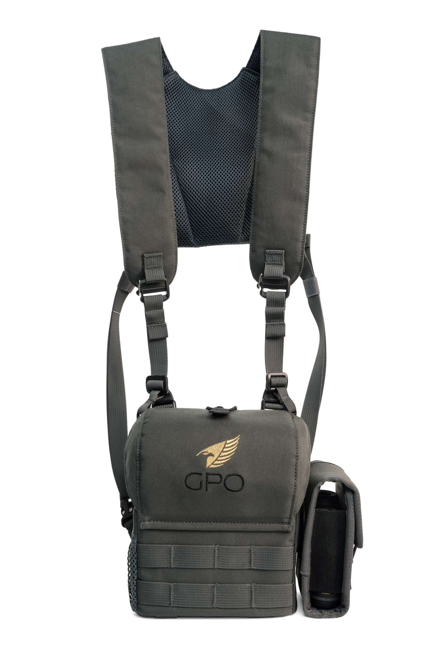 Der GPO Harness PRO ist die ultimative Lösung für Abenteurer, Outdoor-Enthusiasten und Jäger, die von ihrer Ausrüstung sowohl Haltbarkeit als auch Funktionalität erwarten. Der aus extrem robustem 500D Nylon MOLLE gefertigte Gurt schützt Ihr Fernglas und sorgt dafür, dass es immer in Reichweite ist – ohne dass es unkontrolliert herumbaumelt. Der GPO Harness PRO ist auf Ferngläser mit den Massen B x H x T: 170mm x 170mm x 85mm zugeschnitten und bietet einen passgenauen Sitz für Ihre Optiken. Er ist somit für alle GPO Ferngläser, ausser den PASSION ED x56 und PASSION HD x50 Ferngläsern, geeignet.