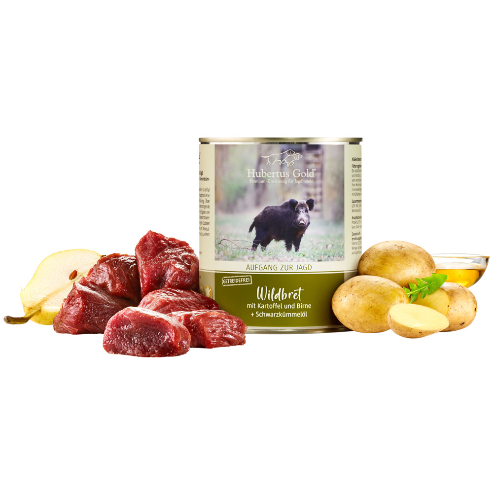 Die Kombination aus Wild mit gesunder Kartoffel und vitaminreicher Birne und Löwenzahn bietet Ihrem Jagdhund eine leckere und leicht verdauliche Vollnahrung. Über 60% Fleischanteil, zeugen für die hervorragende Qualität von Hubertus Gold. Durch die Zugabe von Schwarzkümmelöl erhält Ihr Hund lebensnotwendige ungesättigte Fettsäuren. Diese guten Zutaten zusammen mit wichtigen Vitaminen und Mineralstoffen kann die Gesundheit fördern und zu einem glänzenden Fell beitragen. Alleinfuttermittel
