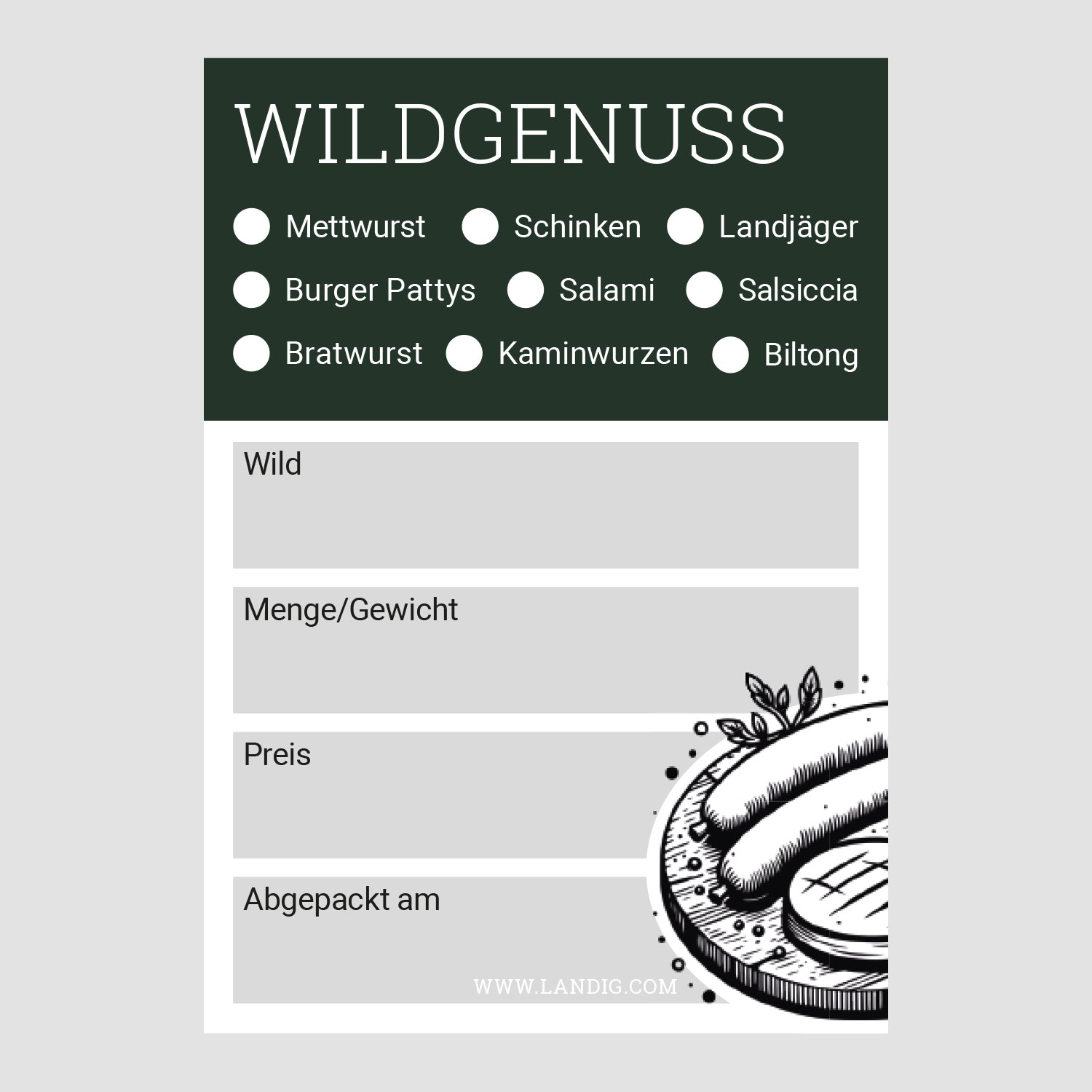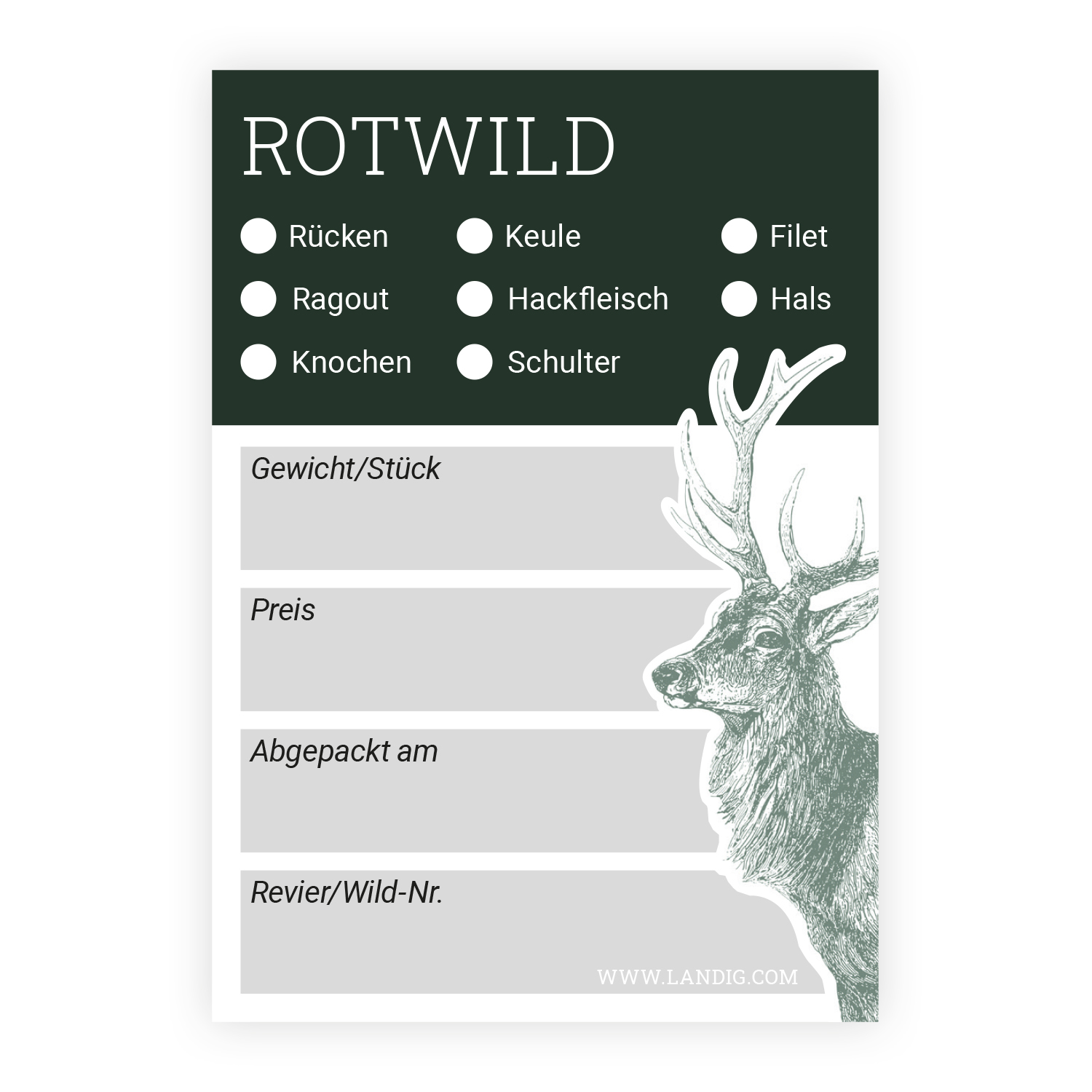 | Ausführung | Wildbret (100 Stk.), Rehwild (100 Stk.), Rotwild (100 Stk.), Schwarzwild (100 Stk.), Wildgenuss (100 Stk.), Wildkammer (100 Stk.) |