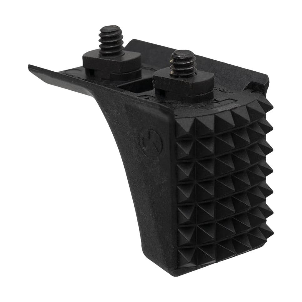 Der Barricade Stop besteht aus einem Polymerkörper und einer texturierten, QPQ ferritisch nitrocarburierten Stahlplatte für sicheren Kontakt mit der Schiessauflage. Die Metallplatte ist leicht gewölbt, um den Kontakt auf unebenen Oberflächen zu optimieren, und bietet die Möglichkeit, die Waffe zu schwenken, ohne den Kontakt zu verlieren.
