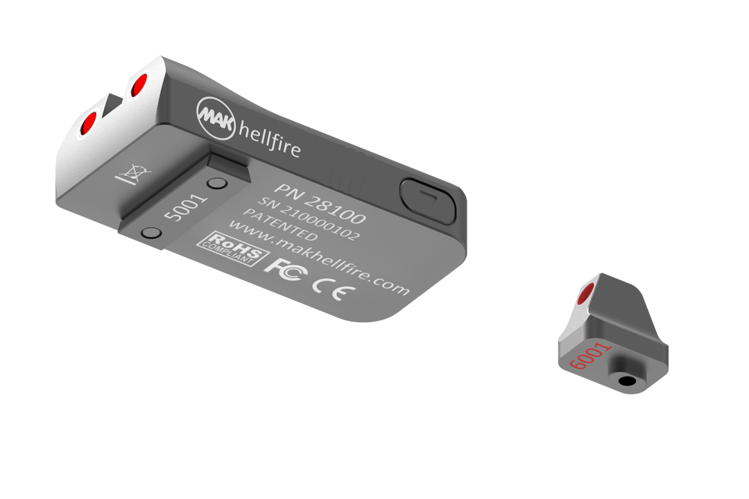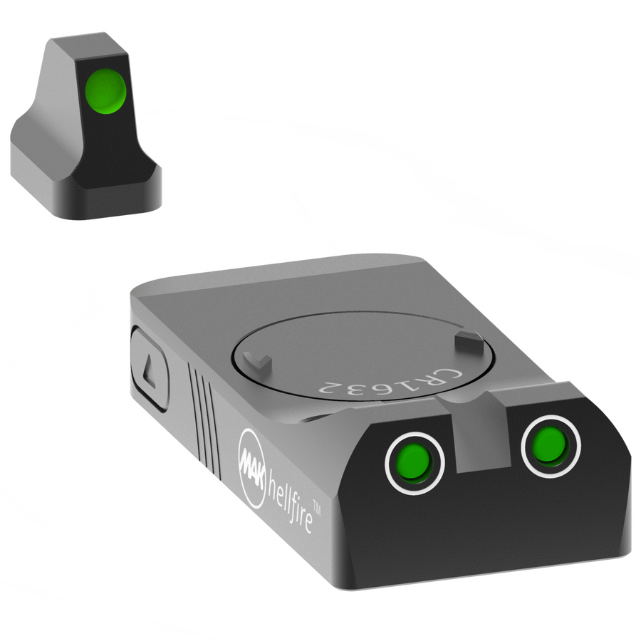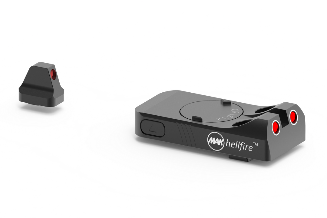 Das MAKhellfire™ ist eine hochentwickelte beleuchtete Kimme mit grüner und roter Beleuchtung, die eine klare Zielerfassung bei allen Lichtverhältnissen ermöglicht. Mit zwei aktiv beleuchteten Zielmarken und einem passiv beleuchteten Korn bietet es hervorragende Sichtbarkeit. Die Helligkeit kann manuell vom NV-Modus bis zur maximalen Helligkeit angepasst werden, um den Gegner zu blenden oder die Schussbereitschaft zu signalisieren. Kompatibel mit Glock® 17/17L, 19/19X, 22, 23, 24, 26, 27, 33, 34, 35, 39 und 45 (ausser M.O.S.™-Modellen). Die CR1632-Batterie hält über 30 Stunden.