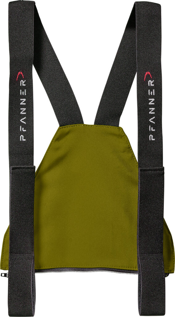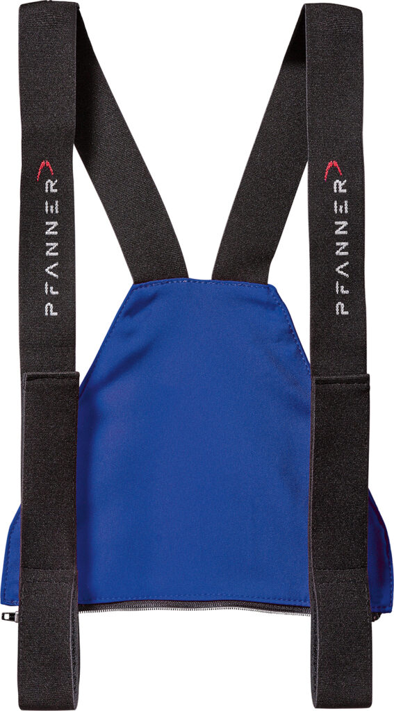 Anzippbarer Rückenschutz mit Hosenträgern, Länge mittels Klettverschluss verstellbar.