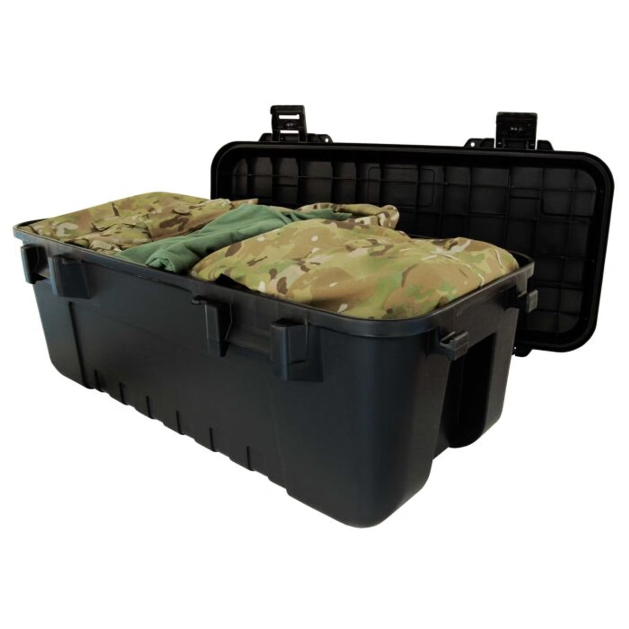 Lagern und transportieren Sie Ihre gesamte Ausrüstung in dieser NATO-zugelassenen, robusten Aufbewahrungsbox. Diese Aufbewahrungsbox für Sportler wurde für einfache Lagerung und Transport mit einem robusten, verstärkten, abnehmbaren Deckel entwickelt, der eine sichere Lagerung der Geräte ermöglicht. Der vollständig abnehmbare Deckel sitzt fest auf der Aufbewahrungsbox. Befestigen Sie die Box mit vier robusten, rostfreien Riegeln und Vorhängeschlosslaschen für zusätzliche Sicherheit. An jedem Ende der Aufbewahrungsbox für Sportler befinden sich Befestigungshalterungen (für Gummiseile usw.). Dazu gehören auch versenkte Griffe und verbesserte Räder mit robusten neuen und verbesserten Metallachsen für den Transport. Auf unserer Website ist auch ein Doppelpack erhältlich.