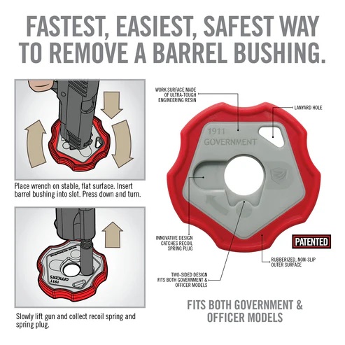 Finally, a solution to the problem you've been dealing with for years. Removing the barrel bushing on your 1911 has never been easier. Press and turn. The ingenious design keeps the spring and plug corralledand you out of the dentist's chair.