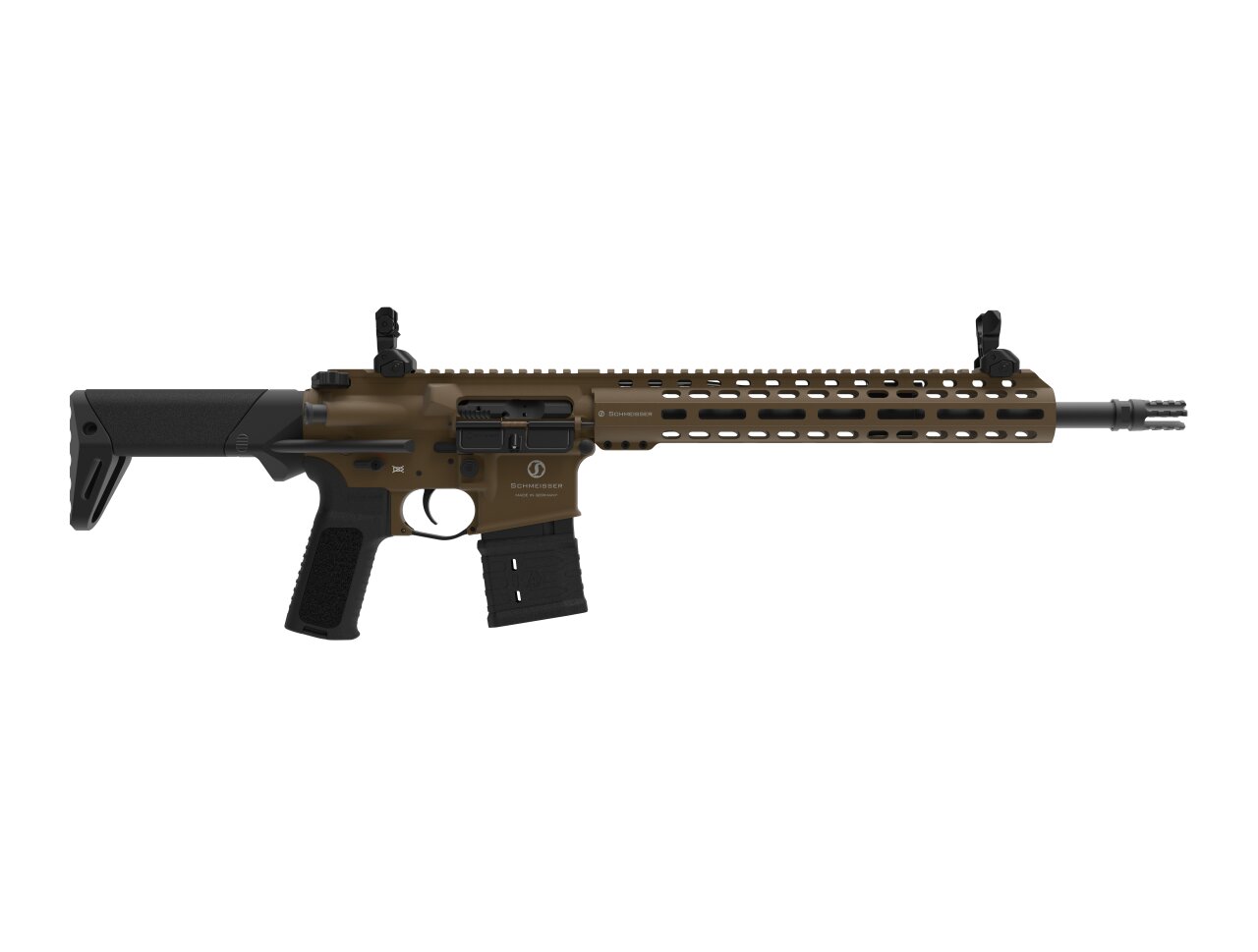 Die Schmeisser AR15 ist eine besonders führige SL-Büchse für die Anwendungsbereiche Jagd und Sport mit freischwingendem Lauf. Diese Waffe hat einen No Flash Mündungsfeuerdämpfer, einen schlanken M-Lok Vorderschaft und einen verstellbaren Stahlgasblock. Der Two-Stage Trigger garantiert eine klar definierte trockene Schußauslösung. Sowohl Sicherung, Magazinauslöser, Durchladehebel als auch Verschlussfang sind beidseitig ausgelegt. Die Solid-Verstärkung am Lower erhöht die Stabilitität um ein Vielfaches gegenüber herkömmlichen AR15. Auslieferung erfolgt serienmäßig mit 10 Schuss Magazin und Flip-up Visierung.