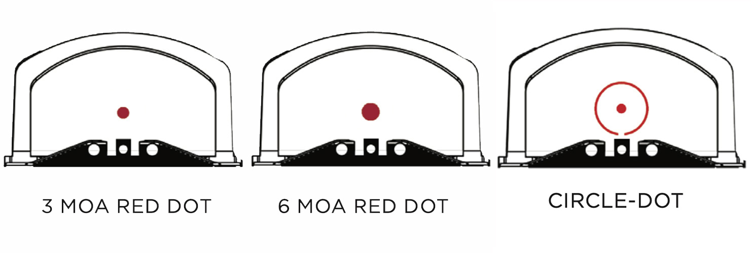 Circle Dot, 3 MOA Red Dot, 3 MOA Red Dot Large Shroud, 6 MOA Red Dot, 6 MOA Red Dot Large Shroud