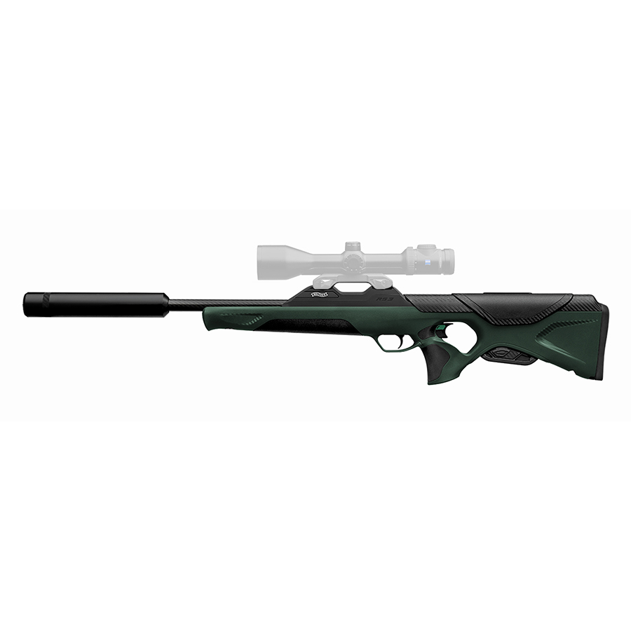 Der Walther RS3 Pro Pine mit dunkelgrünem Synthetikschaft und schwarzen Elastomer-Einlagen und griffiger Struktur. Zusätzliche Zweibein-Aufnahme am Vorderschaft.